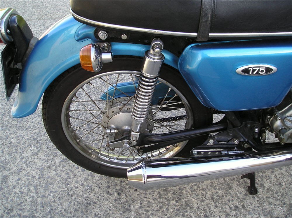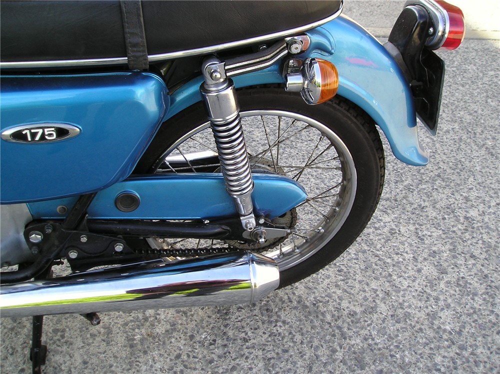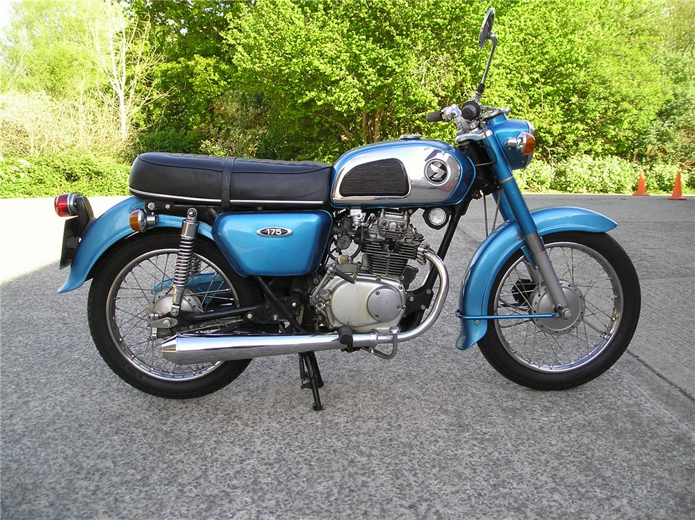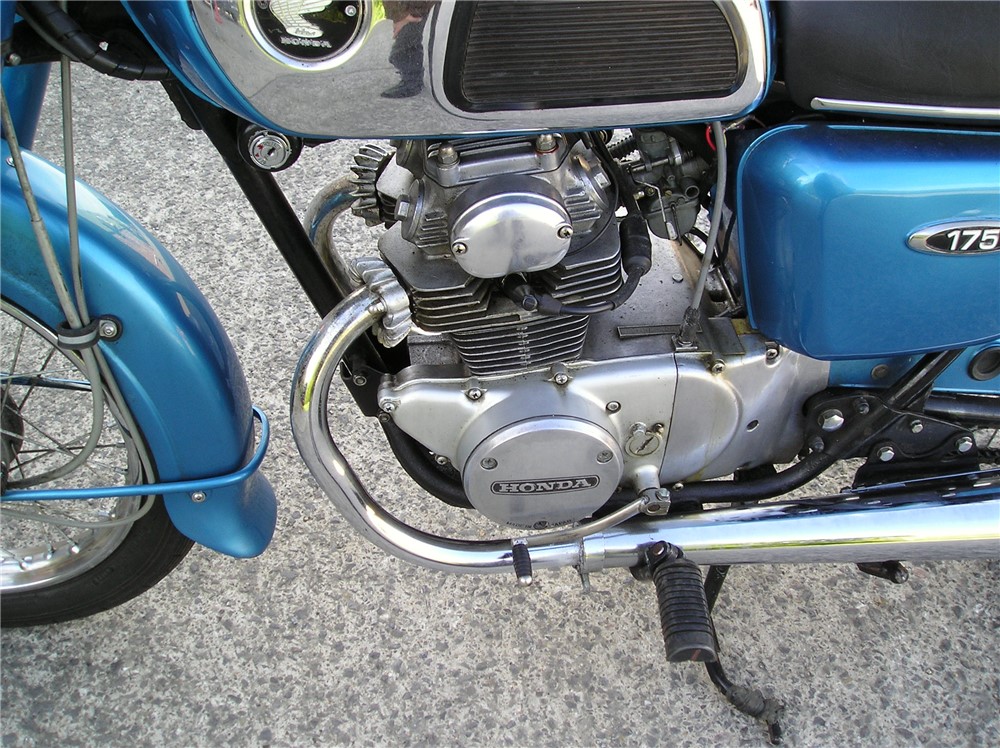 This is a sound little CD175 that starts and runs well,and which went fine on test. It's not a showpiece,but is an attractive and usable bike that benefits from electronic ignition,new tyres,recent oil change etc. It has aftermarket silencers fitted which I have to say give it quite a beefy exhaust note that you would expect from a bigger bike! Mudguards are solid,paintwork is generally good with a couple of touched up areas,and seat has been recovered at some point,but overall it's a decent,sound example than could be left alone and enjoyed as is,or taken to the next level without too much effort.Comes with a few spares including lower chain guard and original airbox as it's currently running on a K&N filter.