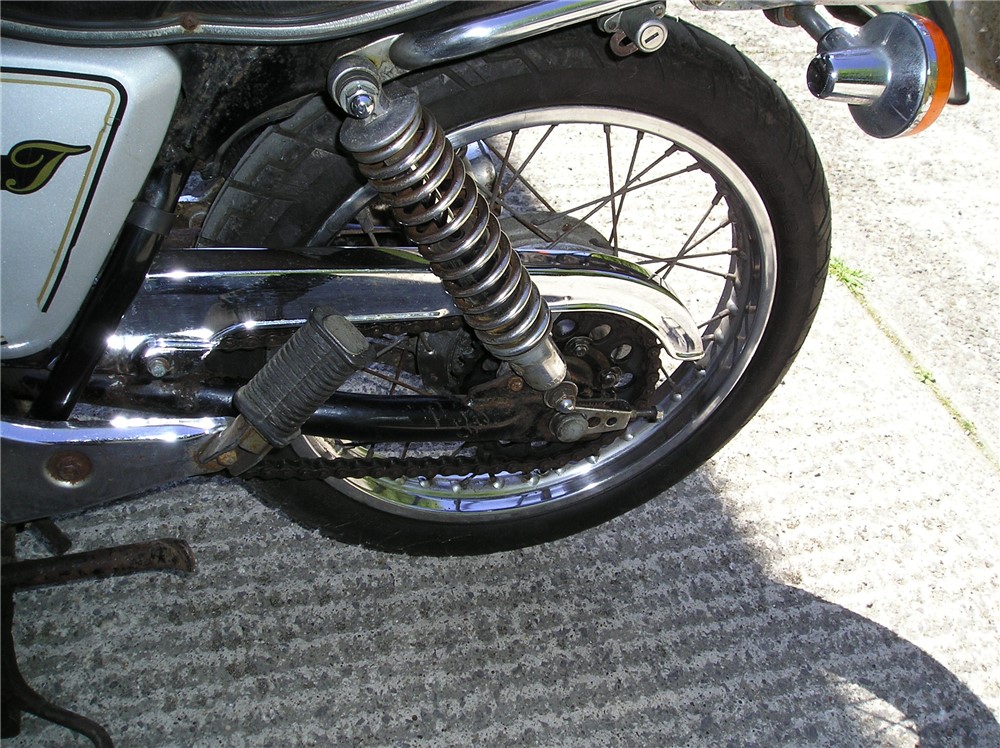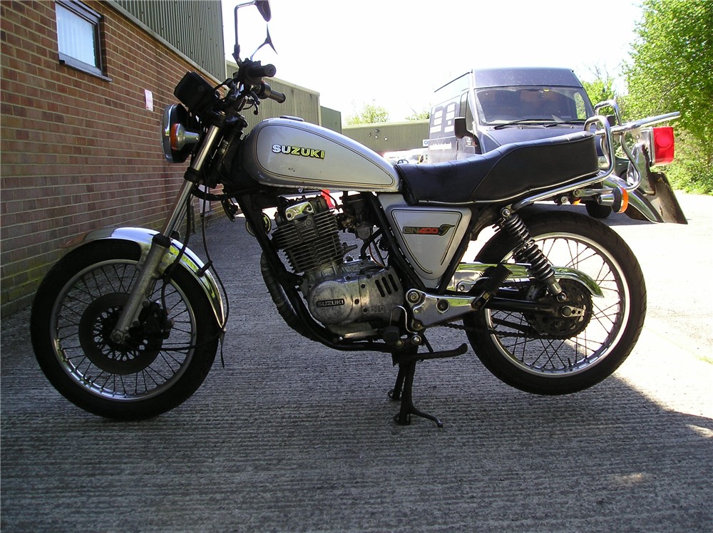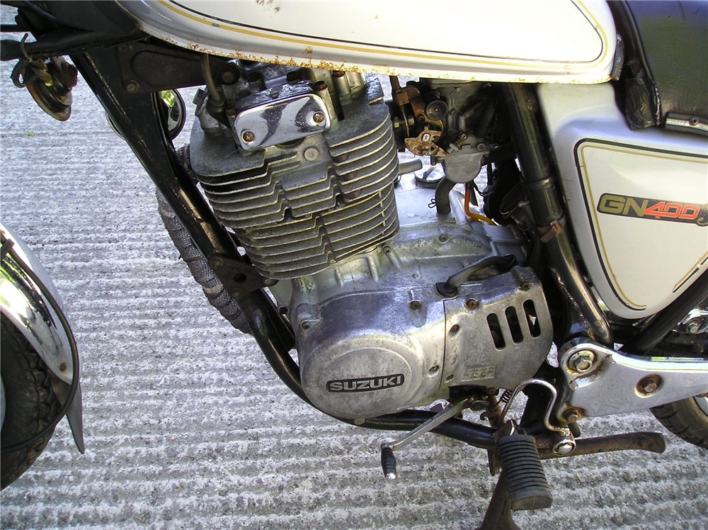 This is a now,quite rare GN400 that hasn't been used for quite some time,but with a carb clean and new battery,fired up very readily,sounds as sweet as anything,and felt fine on a test ride,pulling surprisingly well. Strangely enough,these 400's are 6v electrics and kick start only,and this one certainly has some compression,and although does have a decompressor fitted,you need a strong right leg to start it ! Cosmetically it's showing it's age a bit,but is still an attractive enough looking example of a fairly uncommon bike,and probably best thought of as one to ride and improve.